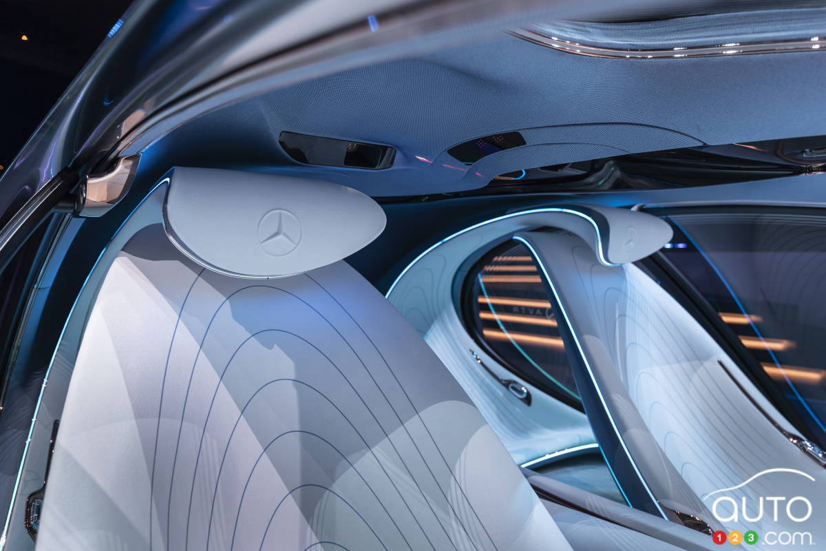 La structure de conception distinctive de l’extérieur a été inspirée par… un bretzel. De l’aveu même de l’équipe de conception de Mercedes, c’est la forme entrelacée d’un bretzel qui a servi de base pour la forme extérieure et le One Bow, cette forme de boucle infinie ou l’arrière du siège qui remonte vers l’avant et sert d’appuie-tête a servi d’inspiration pour l’intérieur.