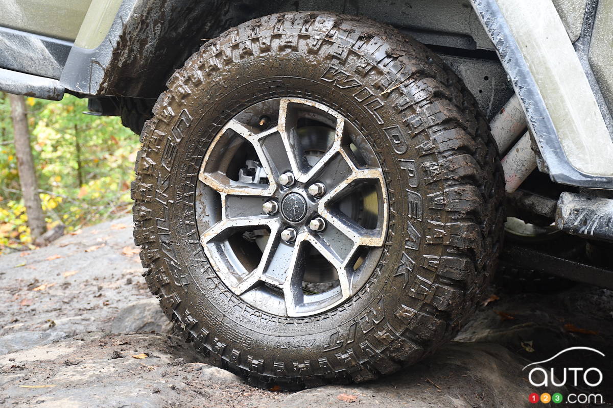 Aussi, le positionnement un peu plus bas de la déclinaison 4xe (et de sa batterie) fait que les plaques de protection sous la carrosserie sont sérieusement mises à contribution lorsque le terrain devient très inhospitalier. C’est aussi le cas avec le Gladiator, simplement en raison de son empattement plus long.