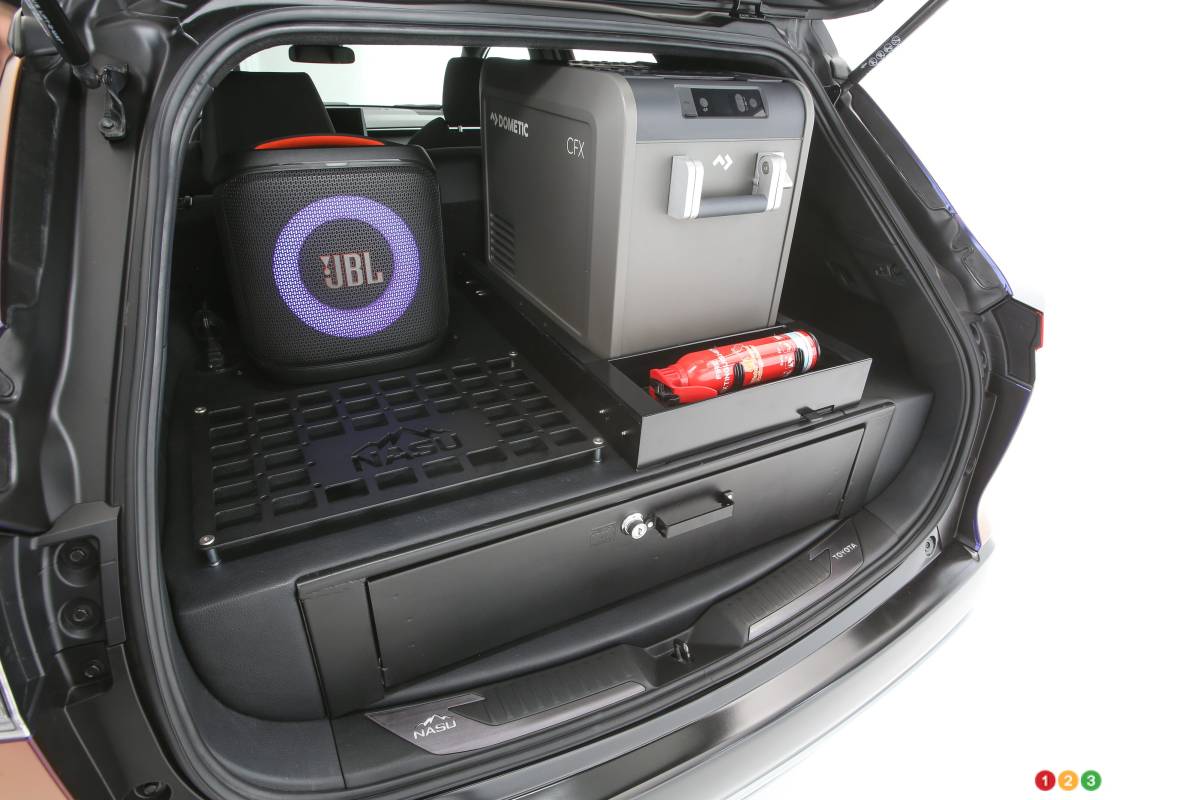 Si le Corolla Cross édition Nasu 2026 profite d’une allure complètement revue, il conserve les éléments mécaniques du modèle de production. Son capot renferme le groupe motopropulseur hybride, soit un moteur à 4 cylindres de 2,0 litres à cycle Atkinson jumelé à trois moteurs électriques. Le tout produit une puissance de 196 chevaux. Le véhicule profite du système à quatre roues motrices.