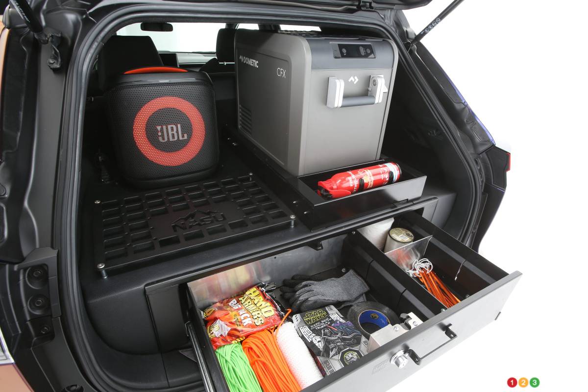 Parmi les autres ajouts, citons les barres de protection latérales (rock sliders), le panier de toit, le porte-bagages articulé modifié, le système de tiroirs sur mesure et le réfrigérateur monté sur coulisse dans le compartiment arrière.
