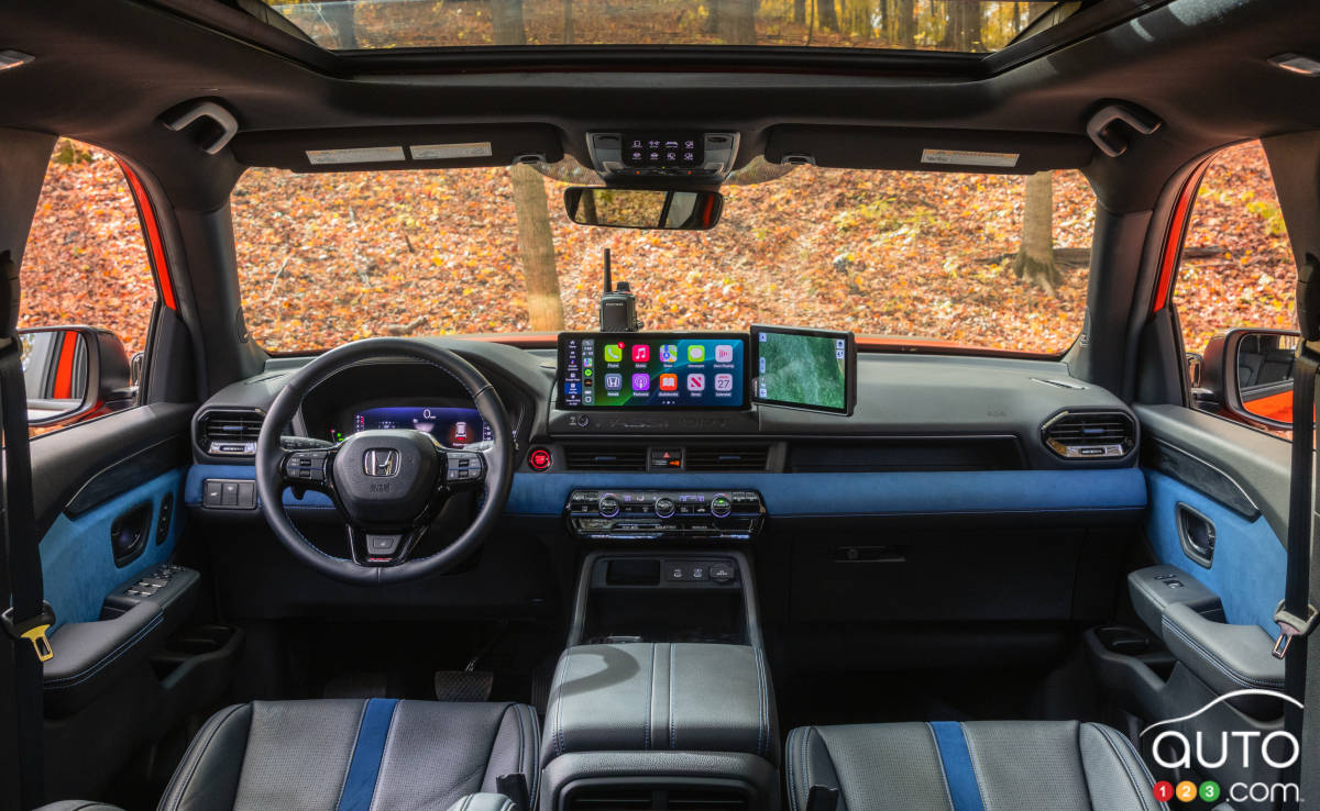 Le toit du véhicule accueille une galerie abaissée, prolongée par un auvent latéral déployable qui transforme le Passport en camp de base mobile. À l'intérieur, l'atmosphère se raffine avec des sièges en Alcantara bleu ornés du sigle HRC et des panneaux modulaires permettant de fixer divers accessoires.