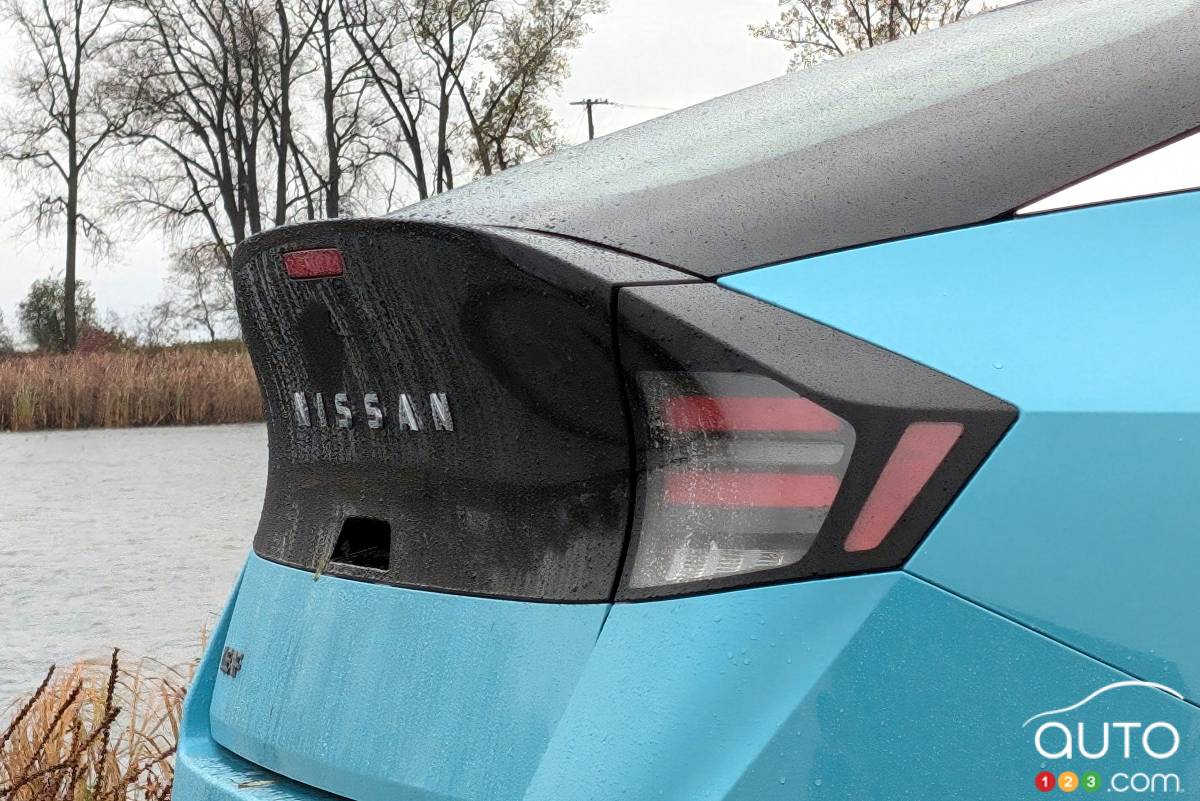 À l’arrière, l’éclairage est assez attrayant avec son motif deux/trois (Nissan signifiant « Deux » et « Trois » en japonais ; il y a plusieurs références à ces chiffres dans le véhicule), avec le lettrage Nissan au centre. Au-dessus se trouve un becquet qui accueille la lunette arrière intégrée de manière fluide, descendant du toit. C’est assez joli, mais cela n’offre pas la meilleure visibilité lorsque le conducteur regarde dans le rétroviseur.