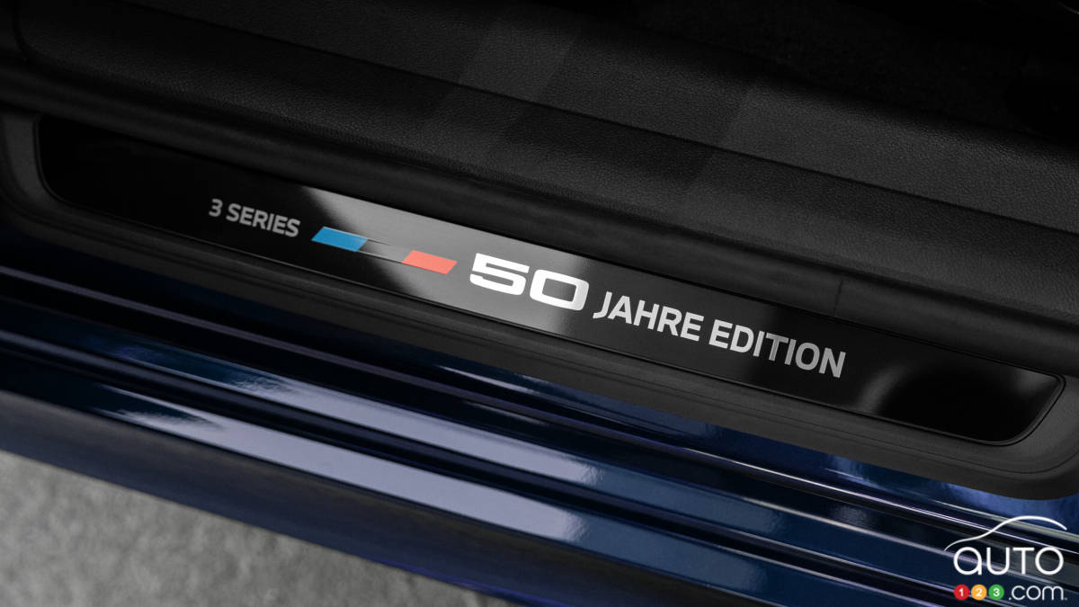 À l’intérieur, BMW a misé sur la finesse du cuir Merino BMW Individual, offert en noir ou en blanc. Une plaque commémorative Série 3 50 Jahre Edition trône sur le cache-gobelet, accompagnée de seuils de portières assortis, rappelant l’exclusivité du modèle.