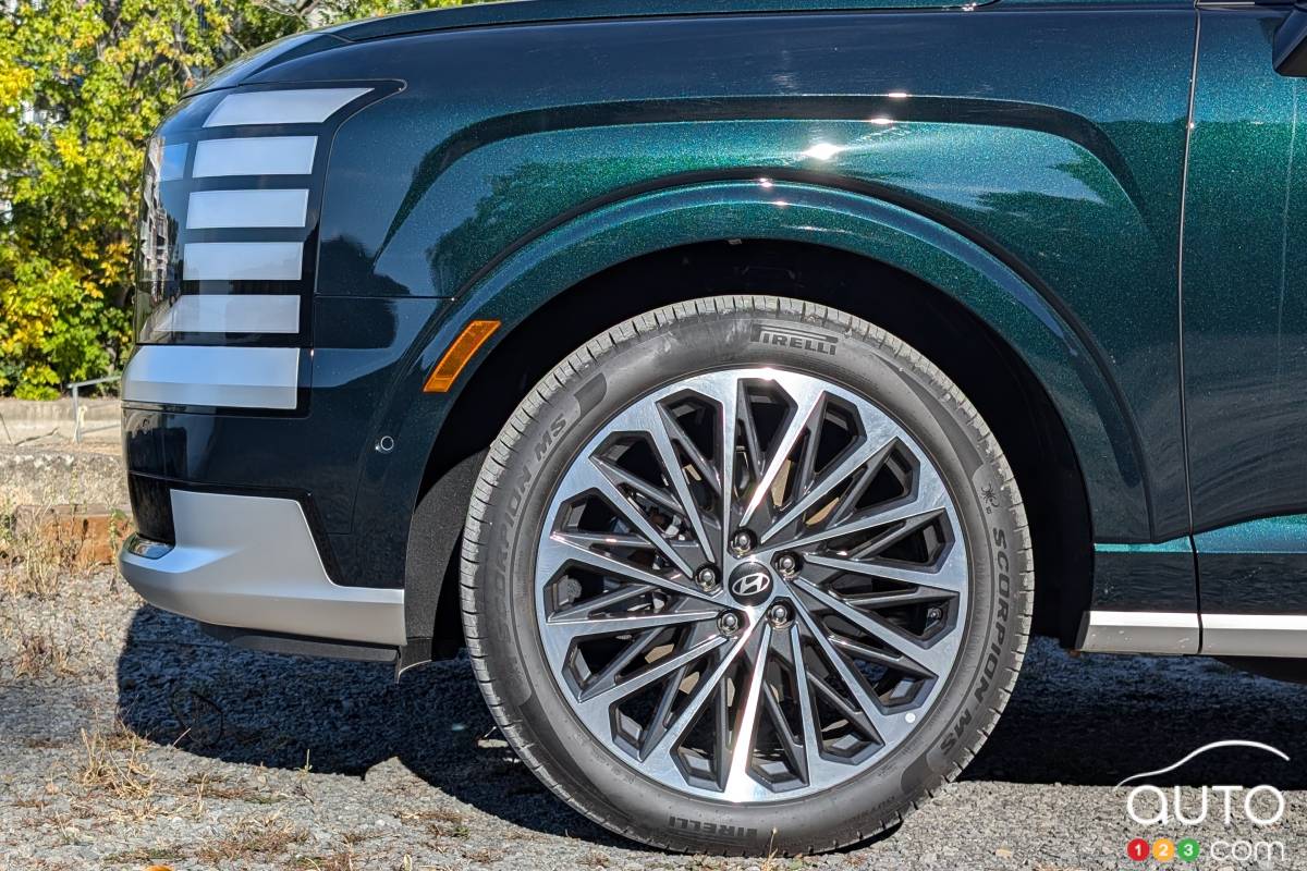 La partie avant est dominée par une large calandre rectangulaire et des signatures de phares verticales. Le profil latéral est épuré et plus traditionnel, avec une ligne de toit plus longue qui ne plonge pas aussi agressivement, ce qui profite à la hauteur sous plafond à l'intérieur. Les passages de roue plus prononcés donnent également au Palisade une allure plus campée.