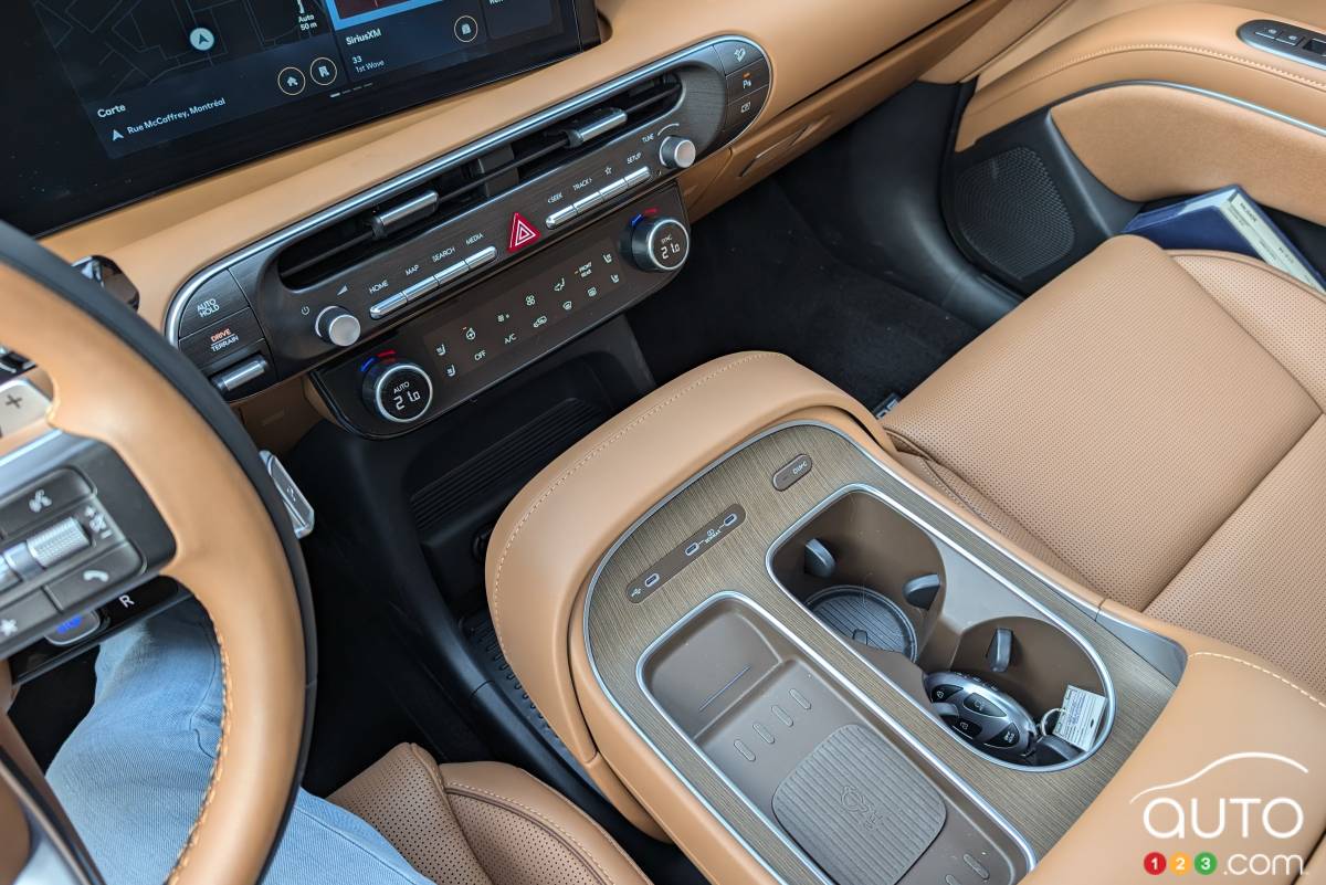 Le sélecteur de vitesse a été déplacé sur la colonne de direction, libérant la console centrale pour le rangement et les porte-gobelets, ainsi que pour deux tapis de recharge sans fil (disponibles en option). Et rassurez-vous, Hyundai a conservé des boutons physiques et des molettes pour les commandes principales de climatisation et de volume. Il n'est donc pas nécessaire de perdre du temps à naviguer dans des menus, ce qui est agaçant et potentiellement dangereux, pour effectuer ces ajustements courants.
