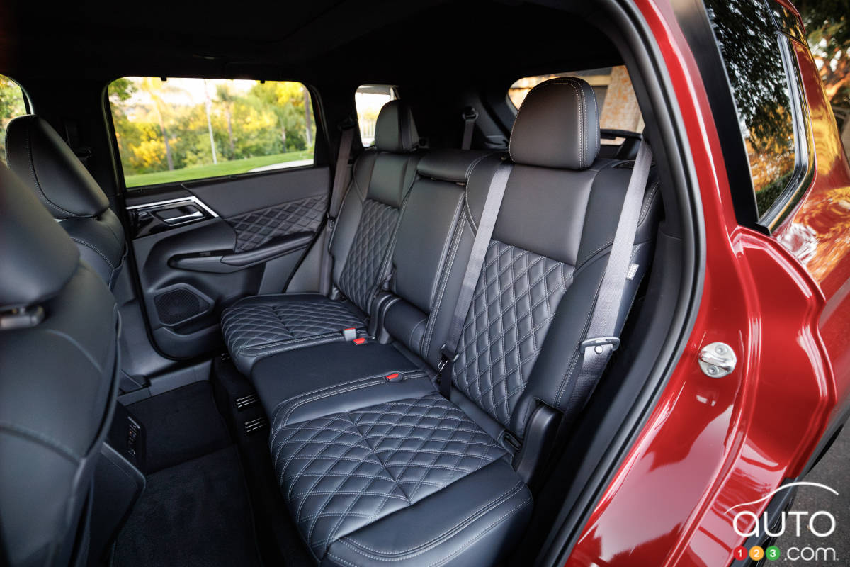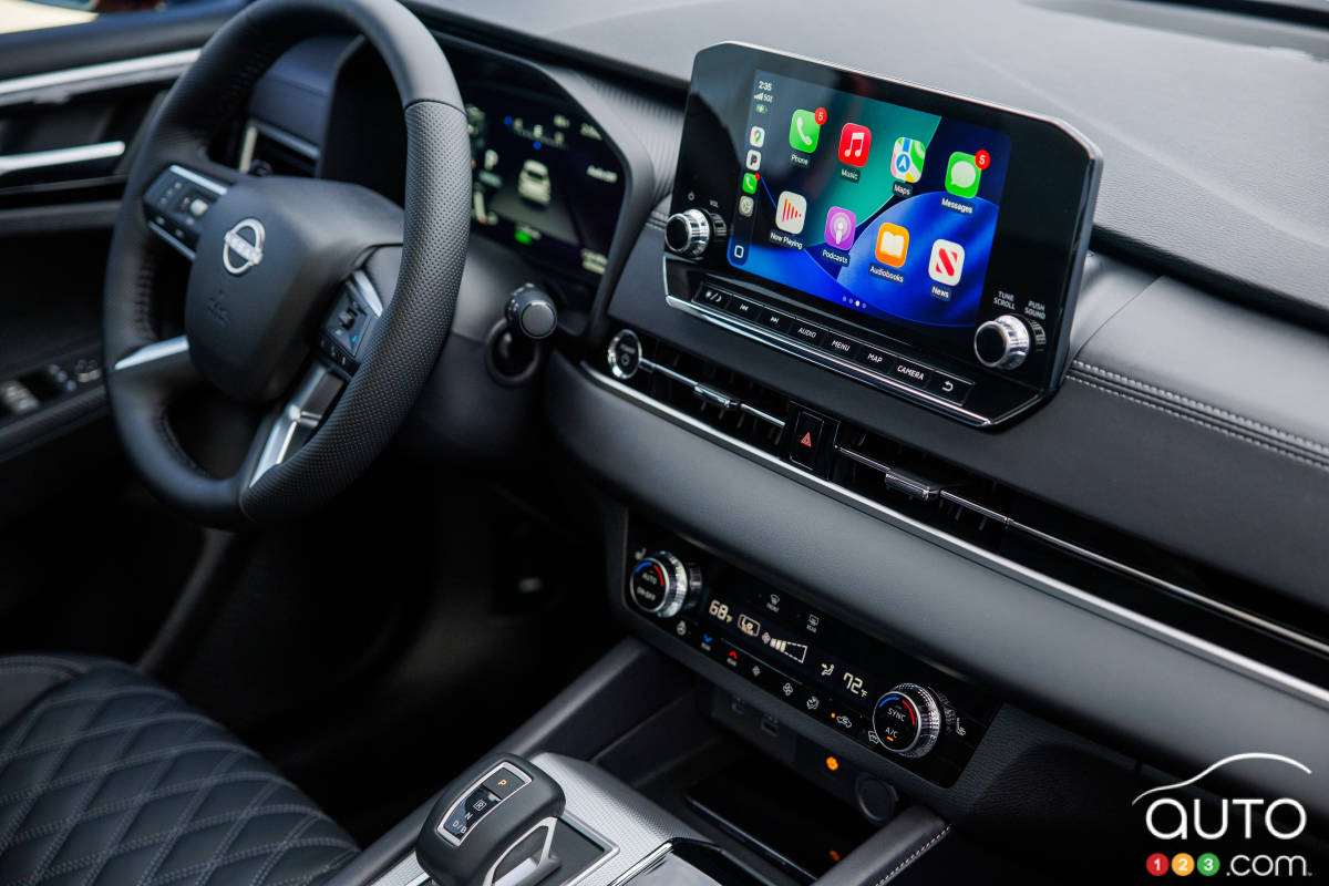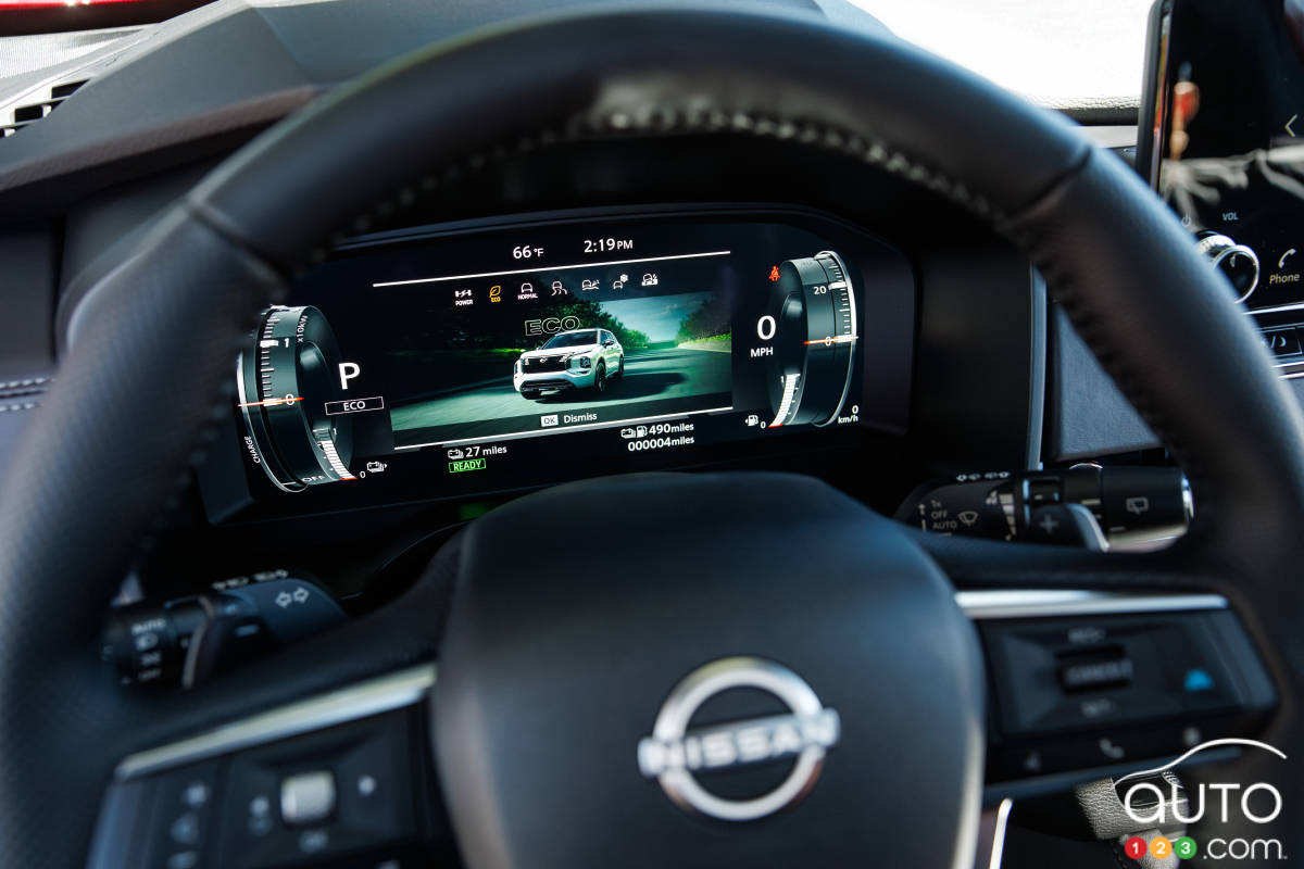 À l’intérieur, on retrouve un écran tactile de 9 pouces ainsi qu’une instrumentation numérique de 12,3 pouces. Comparativement au Nissan Rogue à essence (qui peut accueillir cinq occupants), le modèle doté de la motorisation hybride rechargeable est muni d’une troisième rangée de sièges. Cette caractéristique, inspirée de l’Outlander, permet d’accueillir jusqu’à sept personnes à bord.