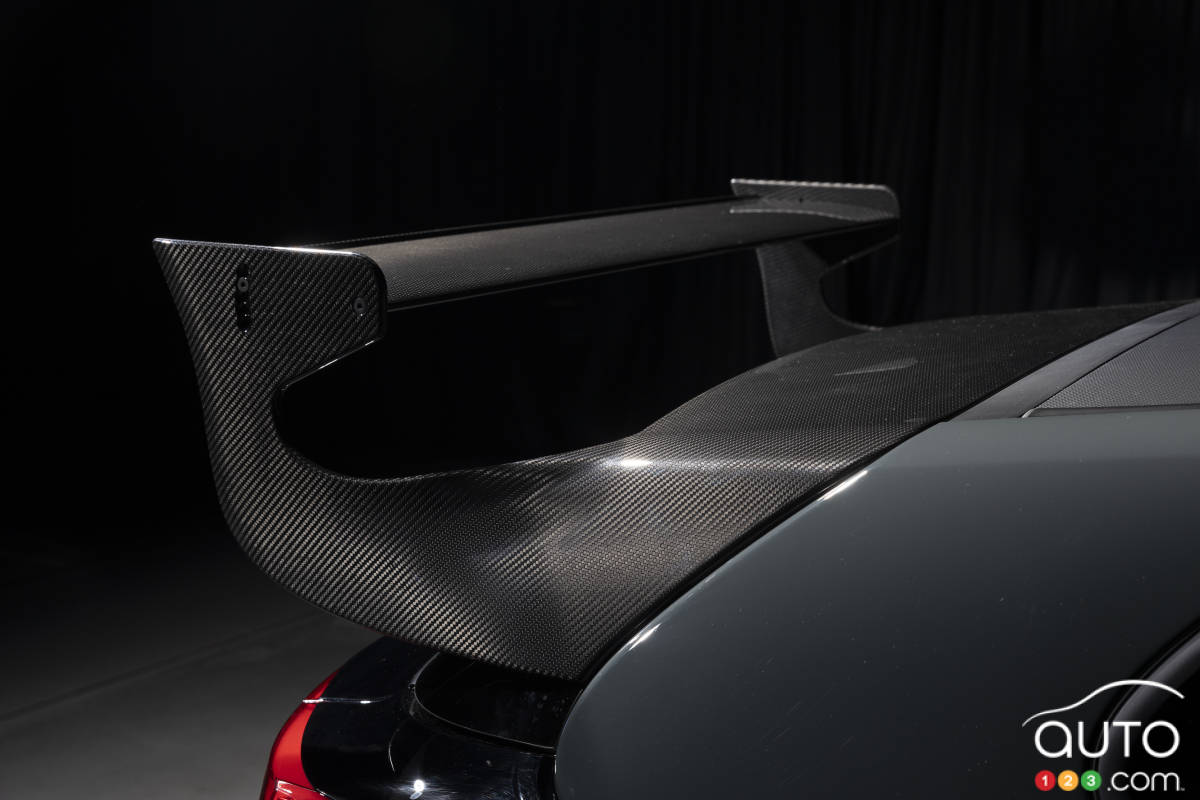 À l’arrière, on retrouve un aileron arrière en fibre de carbone. Celui-ci rehausse considérablement l’appui aérodynamique de la voiture. Elle est aussi munie d’un diffuseur à l’avant, de jupes latérales ainsi que d’un capot en fibre de carbone.