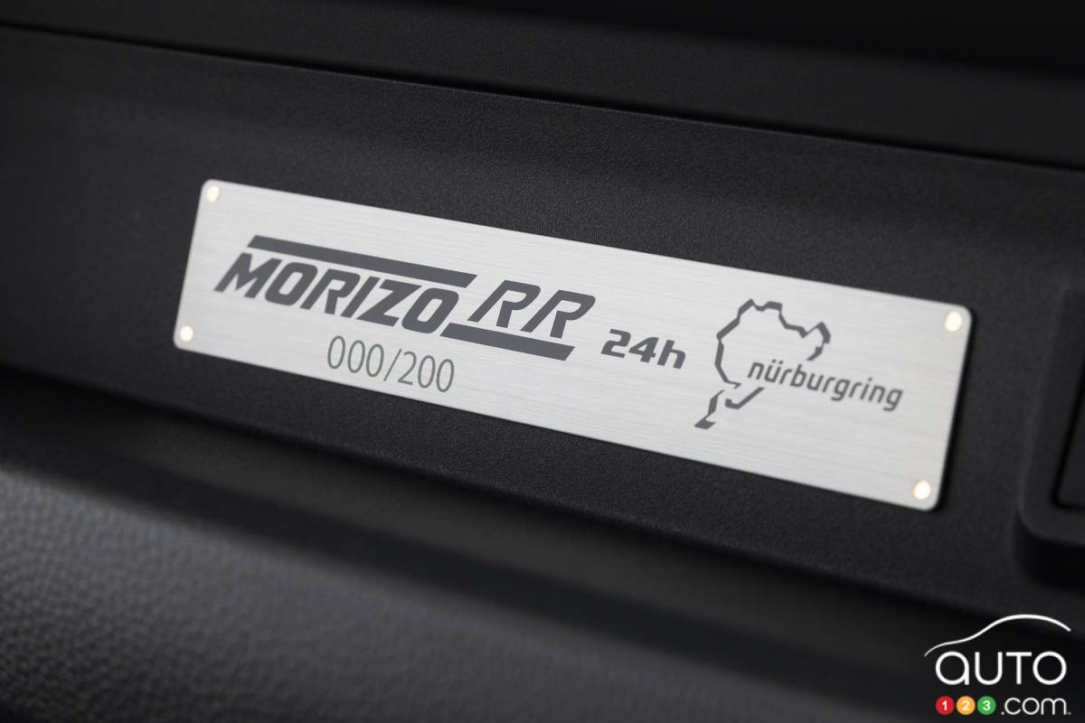 À l’intérieur, on retrouve un volant dont le diamètre est légèrement réduit en comparaison avec la GR Yaris. Les palettes de changement de rapports ainsi que certaines autres commandes ont été retravaillées afin d’optimiser leur utilisation en conduite sportive. Une plaque “MORIZO RR” indique le numéro de série de la voiture.